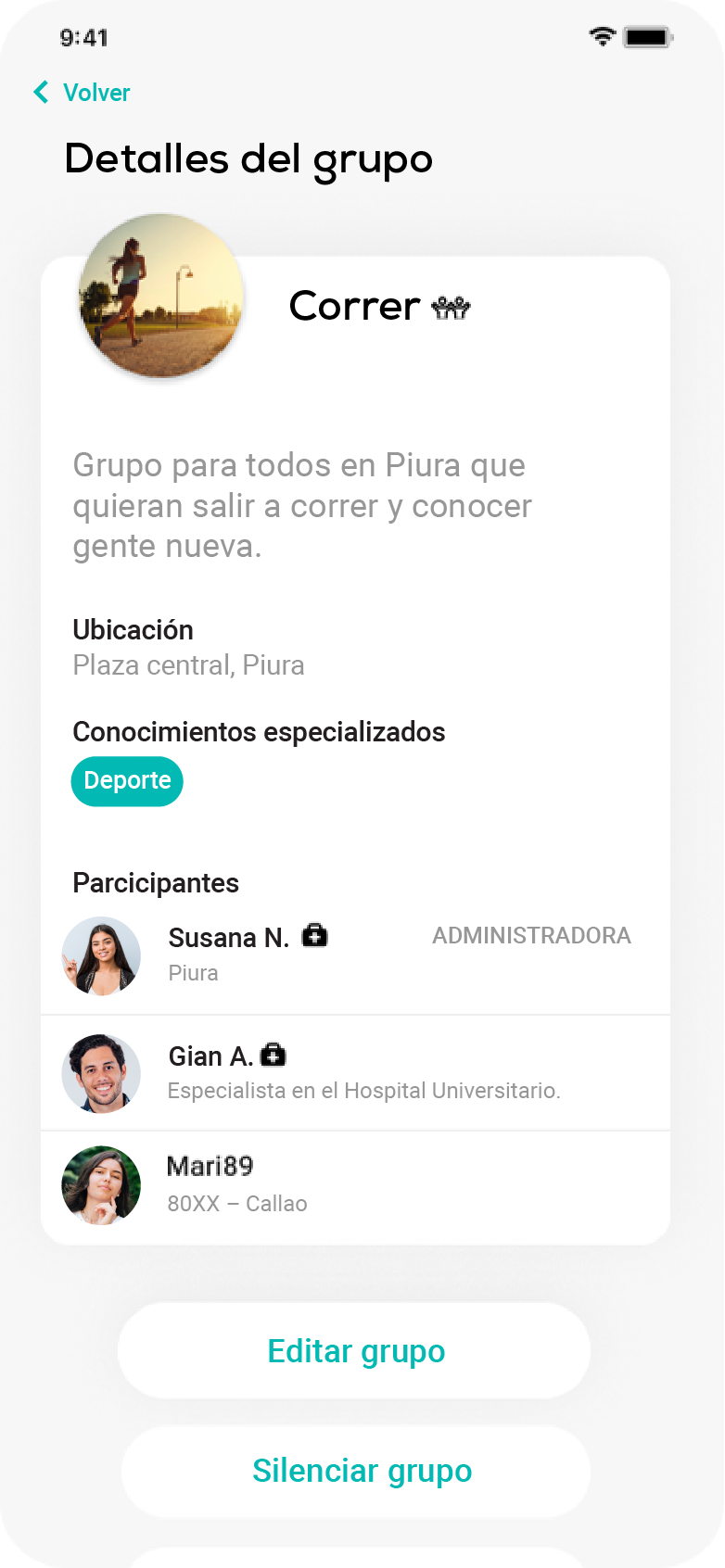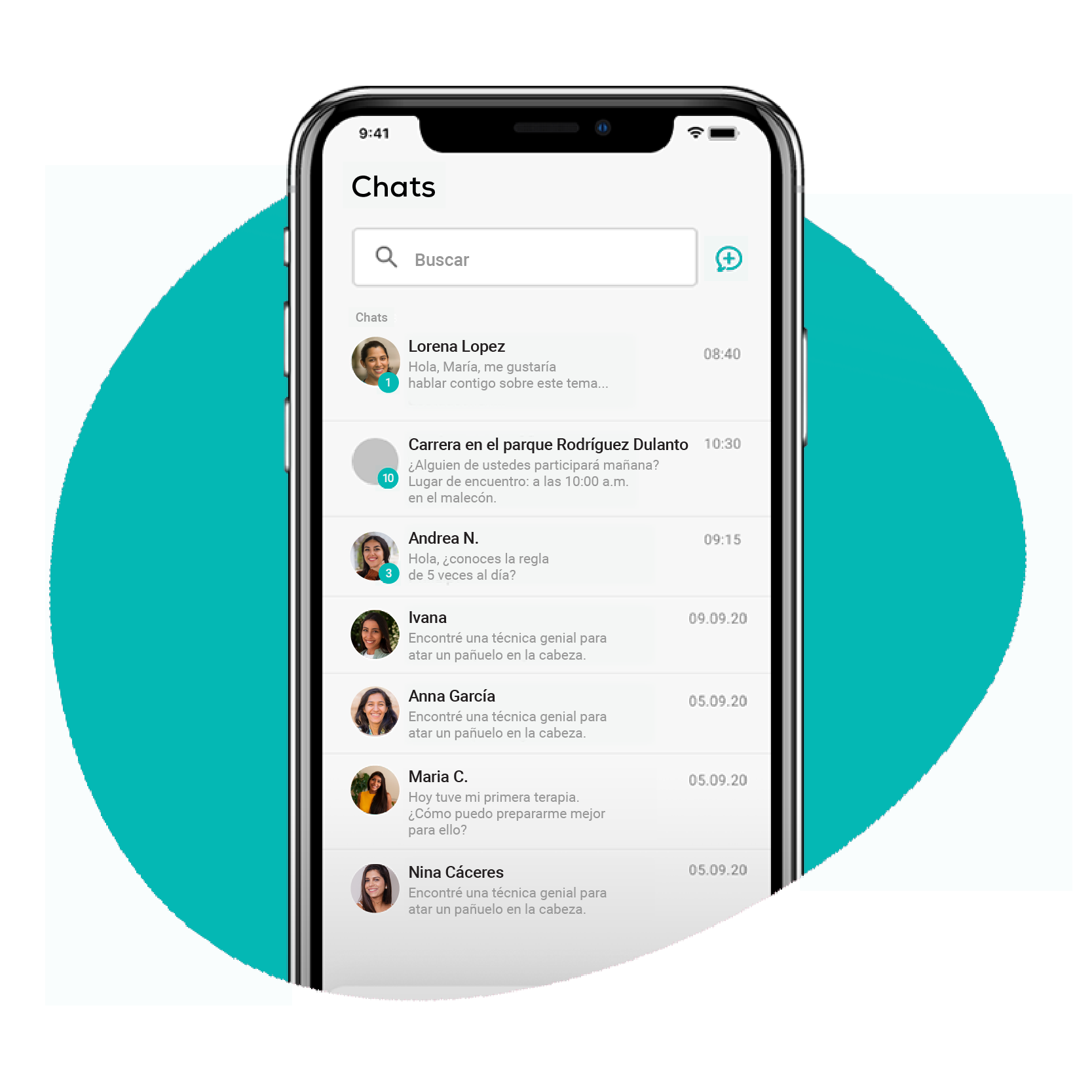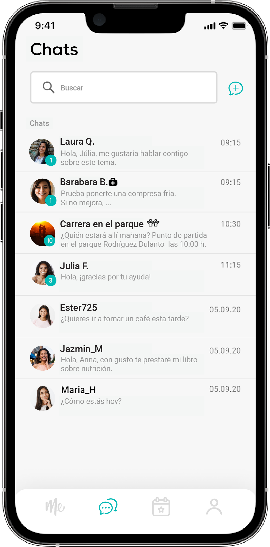 → Charlas grupales uno a uno con otros usuarios de la aplicación sobre temas como nutrición, bienestar, ejercicio, familia, etc.
