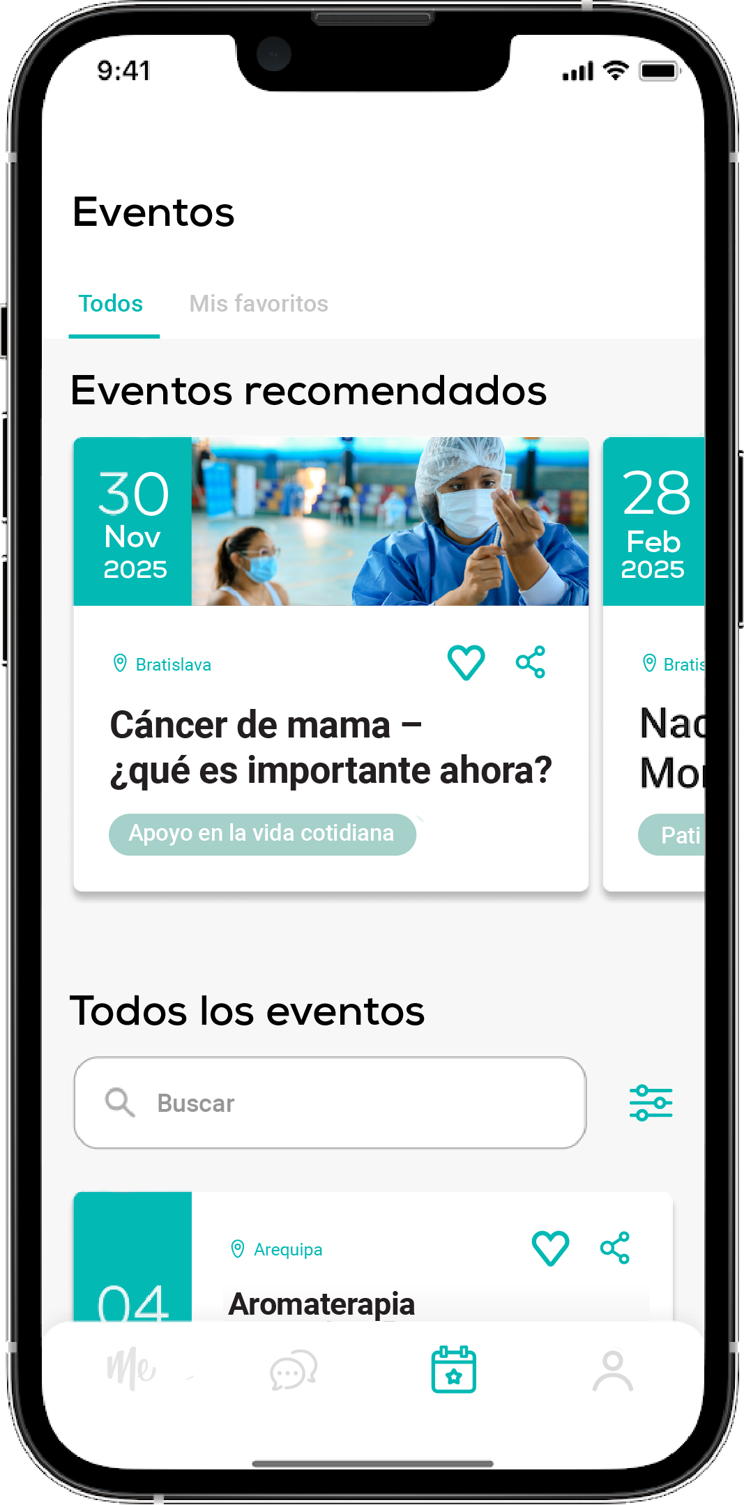 Los hospitales y las organizaciones de pacientes tienen la opción de mostrar sus eventos educativos para pacientes en el calendario de eventos de Focus Me como una forma de invitar y notificar a los pacientes. Los profesionales sanitarios pueden utilizar la función de chat para comunicarse con los pacientes si pueden utilizarla en su centro o consulta.