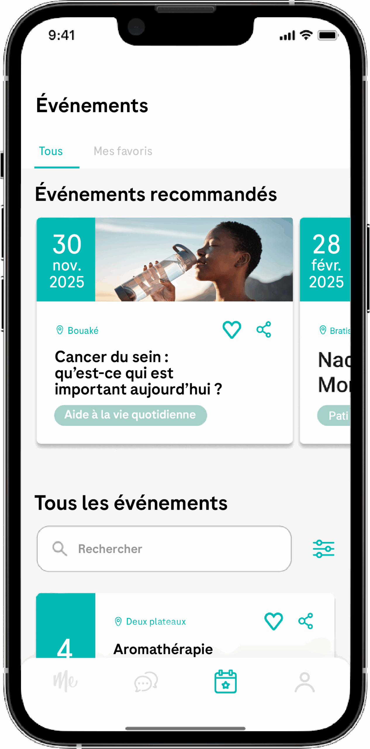 Les hôpitaux et les organisations de patients ont la possibilité d’afficher leurs formations dans le calendrier des événements de Focus Me afin d’y inviter et d’informer leurs patientes. Les soignant-e-s peuvent utiliser la fonction de discussion pour échanger des informations avec les patientes si cela est possible dans le centre ou le cabinet.